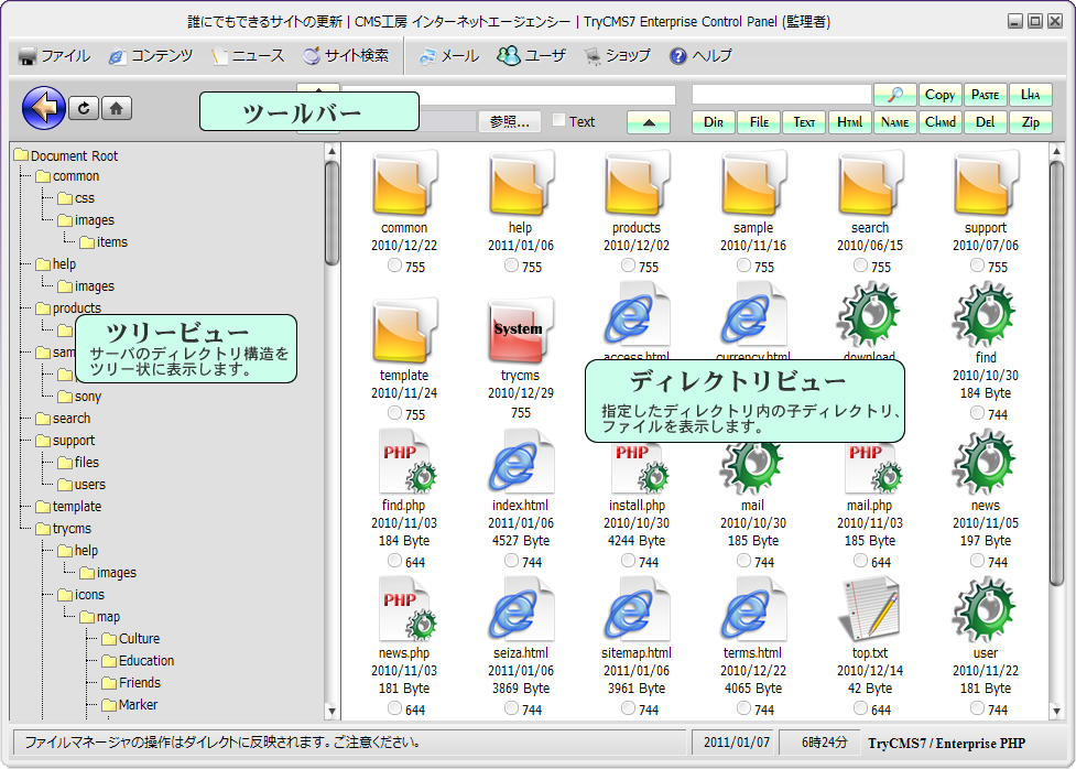 サーバのファイルの構造を忠実にツリーで表示しています。 ディレクトリ名をクリックして、直接ディレクトリにアクセスできます。 - ディレクトリビュー