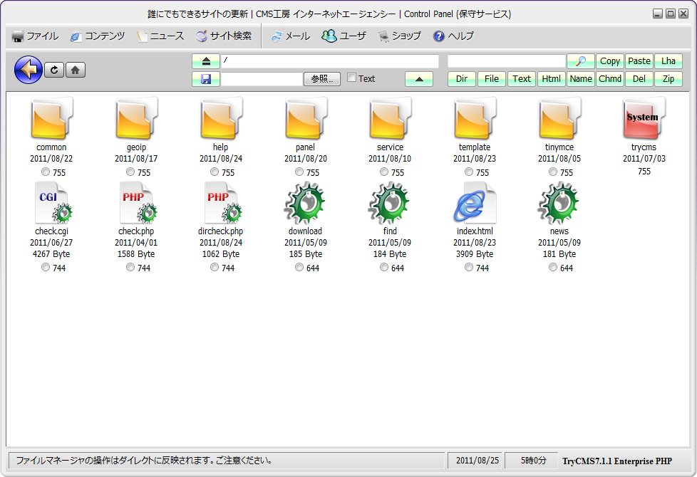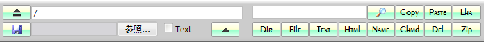 テキストボックスに指定したキーワードでファイルを検索します。 Copy 選択(ラジオボタンをチェック)したファイルをコピーします。 実際には、ファイルではなくファイルのパスを記録しておき、[Paste]時にコピーを実行します。 対象はファイルのみです。ディレクトリをコピーすることは出来ません。 Paste [Copy]でコピーしておいたファイルをカレントディレクトリに貼り付けます。 このとき、既にコピー元のファイルが削除されている場合は貼り付けることが出来ません。 Lha 選択したファイルがディレクトリならlzh形式で圧縮します。 選択したファイルがlzh形式の圧縮ファイルならカレントディレクトリに解凍します。 (サーバがlzhコマンドを許可している場合) Dir カレントディレクトリに新しいディレクトリを作成します。 File カレントディレクトリに新しいファイルを作成します。 作成可能なファイルは、プレーンテキスト(.txt)、htmlファイル(.html)、スタイルシート(.css)、Javascript(.js)で、拡張子は自動的に付加されます。 Text 選択したテキストファイルをテキストエディタで編集します。 Html 選択したhtmlファイルをwysiwyg(ウィジウィグ)エディタで編集します。 Name 選択したディレクトリ、ファイル名を変更します。 Chmd 選択したディレクトリ、ファイルのパーミッションを変更します。 一部のサーバでwebサーバの権限をユーザに許可していない場合は変更できません。 Del 選択したディレクトリまたは、ファイルを削除します。 ディレクトリを削除する場合は、削除するディレクトリの内部は空でなければなりません。 Zip 選択したファイルがディレクトリならzip形式で圧縮します。 選択したファイルがzip形式の圧縮ファイルならカレントディレクトリに解凍します。 (サーバがzip、unzipコマンドを許可している場合) - 選択したテキストファイルを専用のテキストエディタで編集します。