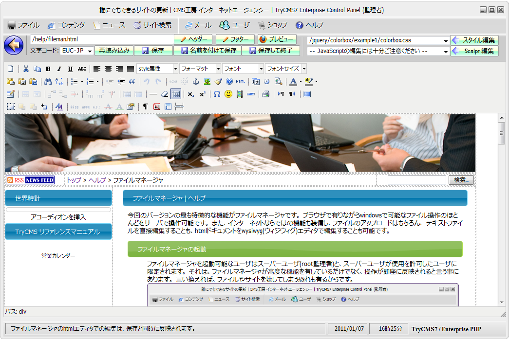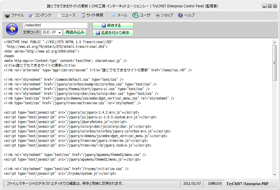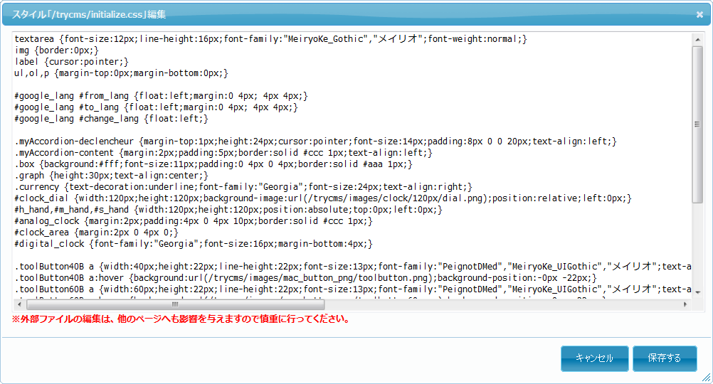編集内容は、保存すると同時に反映されますので十分注意が必要です。 - htmlファイルの編集は最新版のTinyMCEエディタに弊社のプラグインを追加した専用カスタマイズ版で行います。