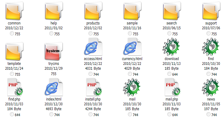 それでは、trycmsの一般的な.htaccessの例です。多くのレンタルサーバ会社はこの設定で大丈夫です。AddHandler server-parsed .html AddHandler x-httpd-php .php DirectoryIndex index.html index.htm index.php index.cgi <Files "news"> ForceType application/x-httpd-php </Files> <Files "find"> ForceType application/x-httpd-php </Files> <Files "mail"> ForceType application/x-httpd-php </Files> <Files "download"> ForceType application/x-httpd-php </Files> <Files "event"> ForceType application/x-httpd-php </Files> <Files "products"> ForceType application/x-httpd-php </Files> <Files "user"> ForceType application/x-httpd-php </Files>