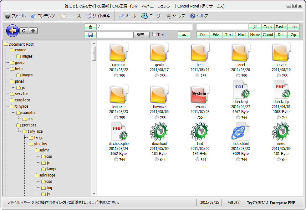 ファイルマネージャは、エンタープライズ版専用の機能で、サーバ上のファイルをFTPを使用しないで自由に操作することを可能にしています。