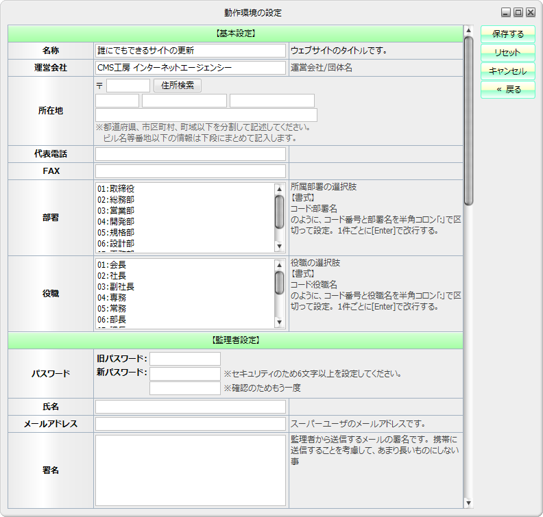 登録管理者の役職を「部署」同様の形式で設定します。 必須では有りませんが、システムではページの一般公開に「承認」機能がありますので、承認者の役職を把握する上で便利です。 - パスワード