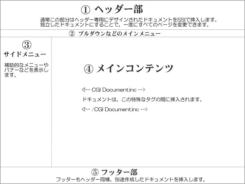 ここが最も重要です。システムは、システム独自のタグを見つけると、この間にシステムが動的に生成したドキュメントを挿入します。 言い換えると、この間のドキュメントは削除されますので、どのようなドキュメントが存在しても問題ありません。 したがって、index.htmlなどの静的htmlページをテンプレートとして使用することも可能です。<!-- CGI Document.inc --> ここにシステムが生成したドキュメントが挿入される <!-- /CGI Document.inc --> - フッター部
