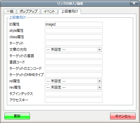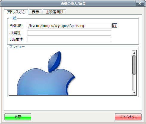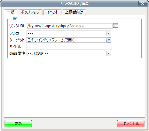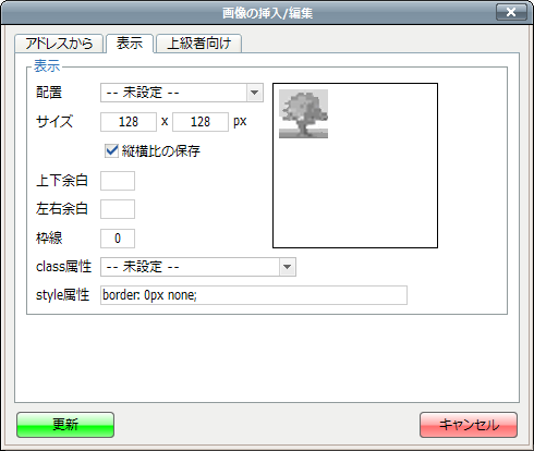 縮小画像の設定は完了ですので[更新]ボタンを押して、画像設定ダイアログを閉じます。 - 今度は拡大画像を設定します。