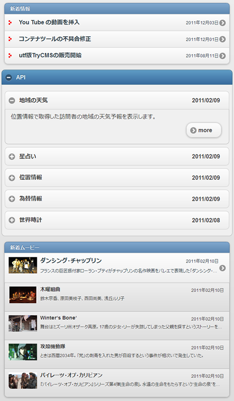 - このページの上部にある「ガジェット」のように、インターネット上で公開されているさまざまな情報(API)を利用して、