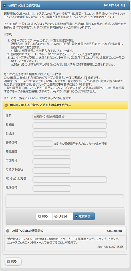 スマートフォンでは、PC同様ニュース記事へのコメント機能もサポートします。 もちろん、7桁郵便番号による住所の自動挿入機能もサポートしています。
